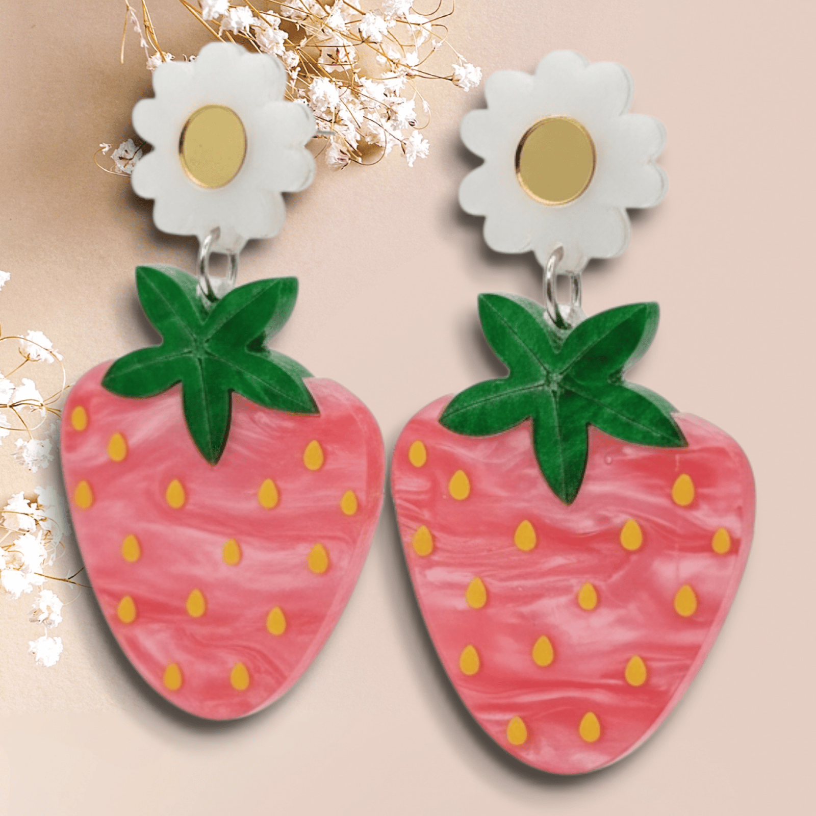 Bring fruity fun to your outfits with strawberry acrylic statement earrings! Lightweight and vibrant, they’re perfect for fruit lovers, playful fashion statements, or adding a pop of color to casual wear.
